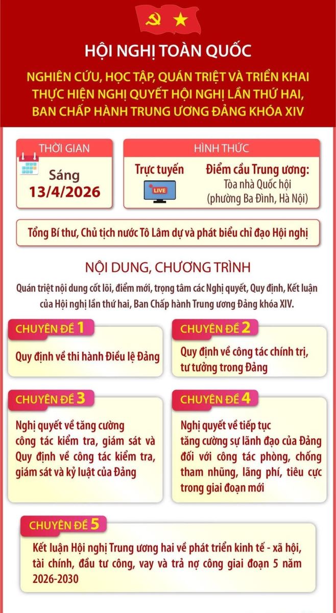 Sáng ngày 13/4/2026, Bộ Chính trị, Ban Bí thư Trung ương Đảng tổ chức Hội nghị toàn quốc nghiên cứu, học tập, quán triệt và triển khai thực hiện Nghị quyết Hội nghị lần thứ hai Ban Chấp hành Trung ương Đảng khóa XIV. Hội nghị được tổ chức theo hình thức trực tiếp từ điểm cầu chính tại phòng họp Diên Hồng, nhà Quốc hội kết nối trực tuyến tới điểm cầu các ban, bộ, ngành, địa phương, các cơ quan. Dự và chỉ đạo ở điểm cầu Trung ương có đồng chí Tô Lâm - Tổng Bí thư BCH Trung ương Đảng, Chủ tịch nước CHXHCN Việt Nam.