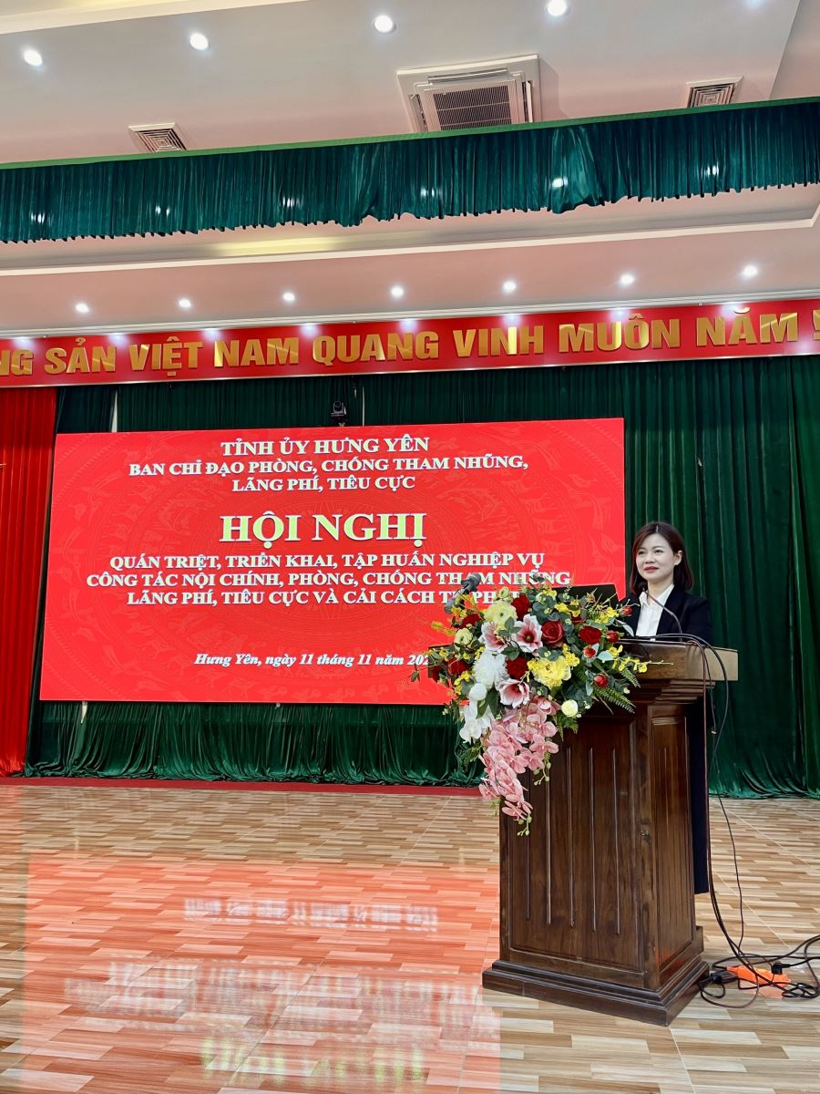 Đồng chí Đặng Thị Thu Hằng, TUV, Phó Trưởng Ban Thường trực Nội chính Tỉnh ủy, Uỷ viên Ban Chỉ đạo tỉnh phát biểu khai mạc hội nghị và trực tiếp truyền đạt Chuyên đề số 01, 02 về công tác nội chính và PCTNLPTC.
