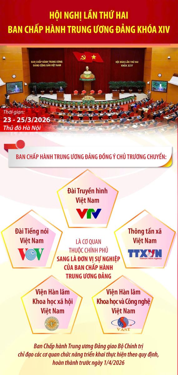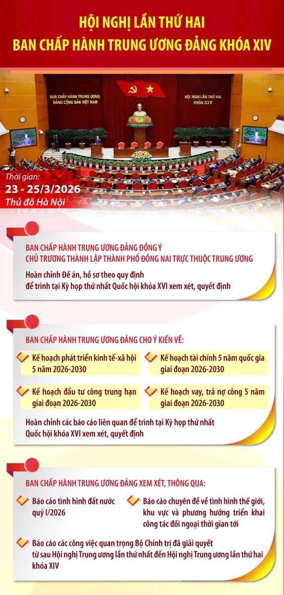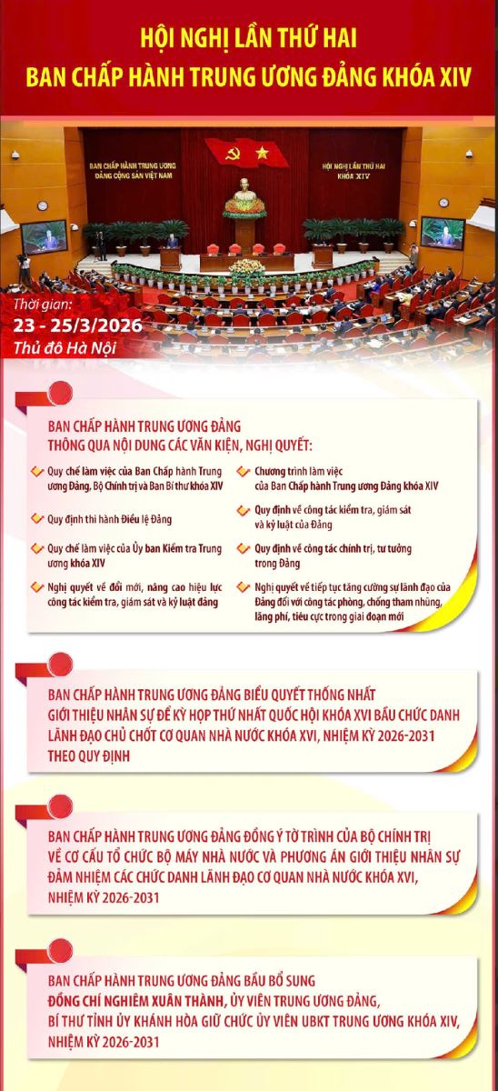 Thực hiện Chương trình làm việc toàn khóa, Hội nghị lần thứ hai Ban Chấp hành Trung ương Đảng khóa XIV họp từ ngày 23/3 đến ngày 25/3/2026 tại Thủ đô Hà Nội. Đồng chí Tổng Bí thư Tô Lâm chủ trì và có bài phát biểu quan trọng khai mạc, bế mạc Hội nghị.