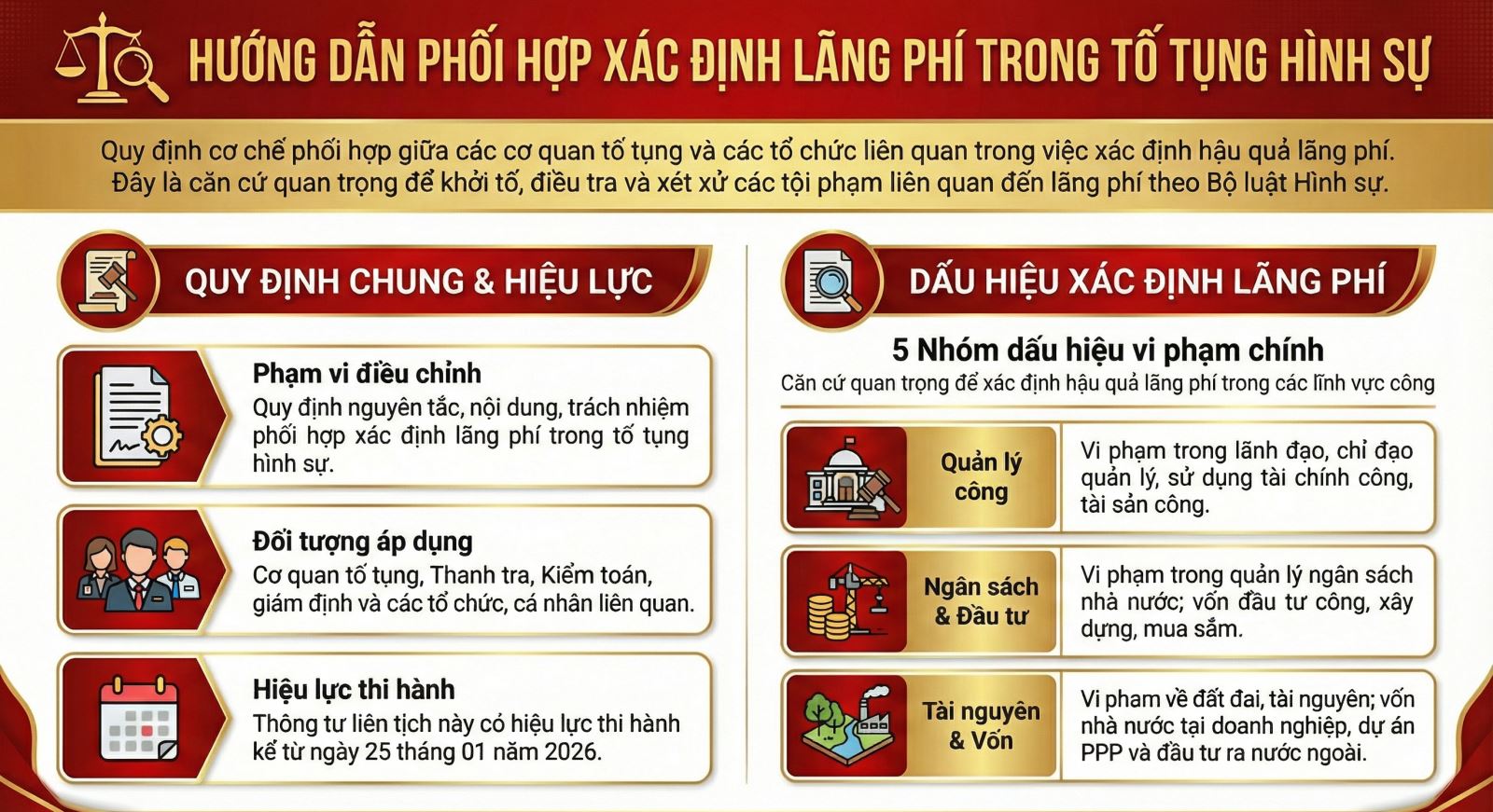 Ngày 10/12/2025, Viện kiểm sát nhân dân tối cao phối hợp với Tòa án nhân dân tối cao, Bộ Công an, Bộ Quốc phòng và các Bộ, ngành Trung ương (Bộ Tư pháp, Tài chính, Công thương, Xây dựng, Nông nghiệp và Môi trường, Kiểm toán nhà nước, Thanh tra Chính phủ) ban hành Thông tư liên tịch số 11/2025/TTLT-VKSNDTC-TANDTC-BCA-BQP-BTP-BTC-BCT-BXD-BNN&MT-KTNN-TTCP hướng dẫn xác định lãng phí để xử lý hình sự các hành vi vi phạm, có hiệu lực thi hành kể từ ngày 25/01/2026.